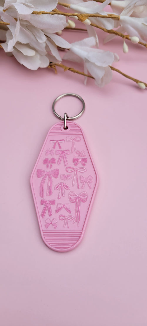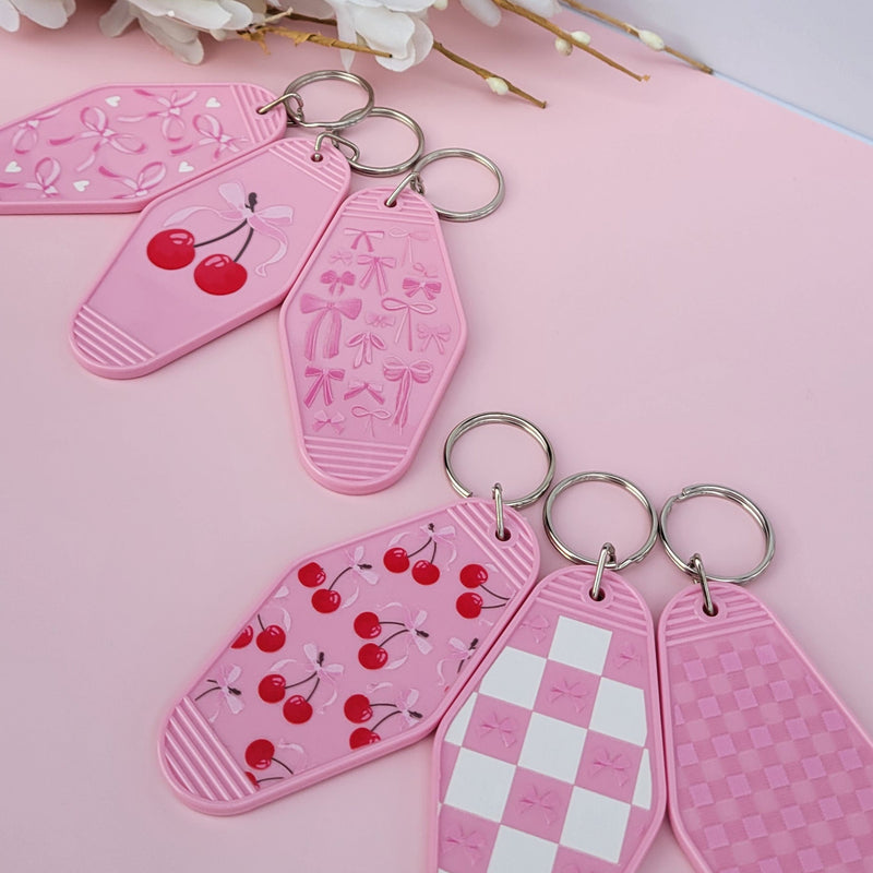 Get one for you and one for your bestie! Our Motel Keychains featuring cherry and bow designs in dusty pink.
