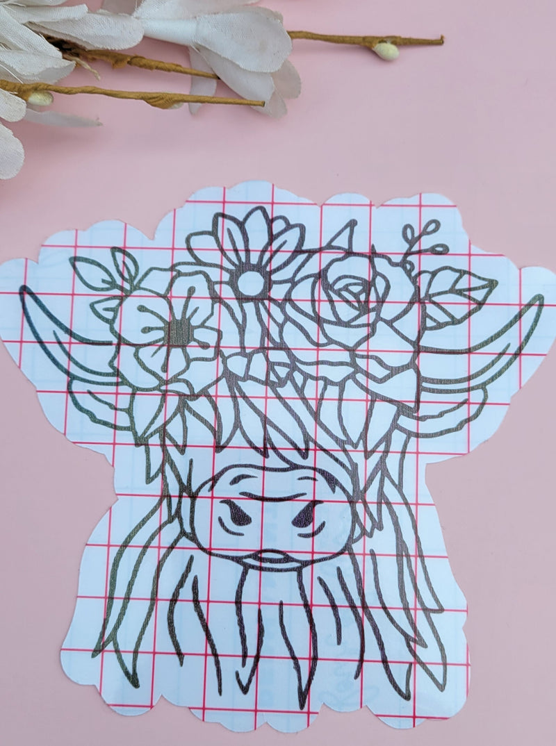 A whimsical sparkly highland cow adorned with a beautiful floral crown. Perfect for adding charm to any surface.